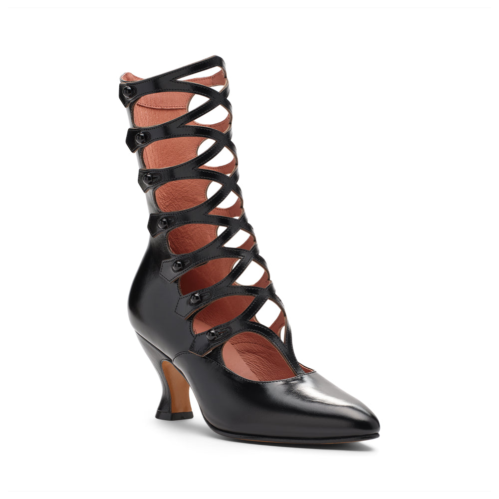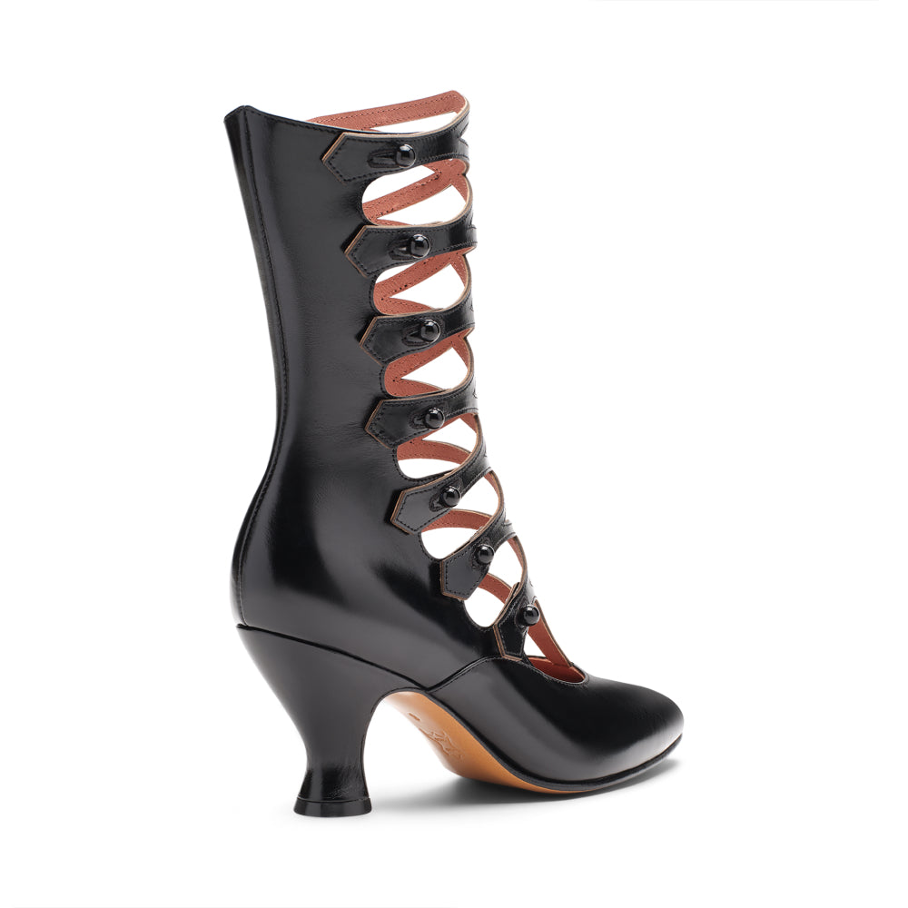 Cleo is the showstopping, sophisticated, and irresistibly seductive Edwardian boot that you have been dreaming of! Exquisitely detailed cutout straps wrap around the leg, with finely shaped strap closures. Cleo features functional button closures, with elastic-mounted half-dome buttons. Cleo's period-accurate, beautifully curved boot shaft caresses the calf and creates that gorgeous historical shape we all crave. Designed on our beloved Edith Edwardian last, Cleo perfectly evokes the aesthetic of late 19th century/early 20th century evening glamour. Cleo features our custom, curvaceous, 3"/7.62 cm French spool heel, and is available in both standard and wide width. Pair Cleo with your favorite Victorian and Edwardian costumes, or wear them with your contemporary skirts and dresses to add elegance to any ensemble.