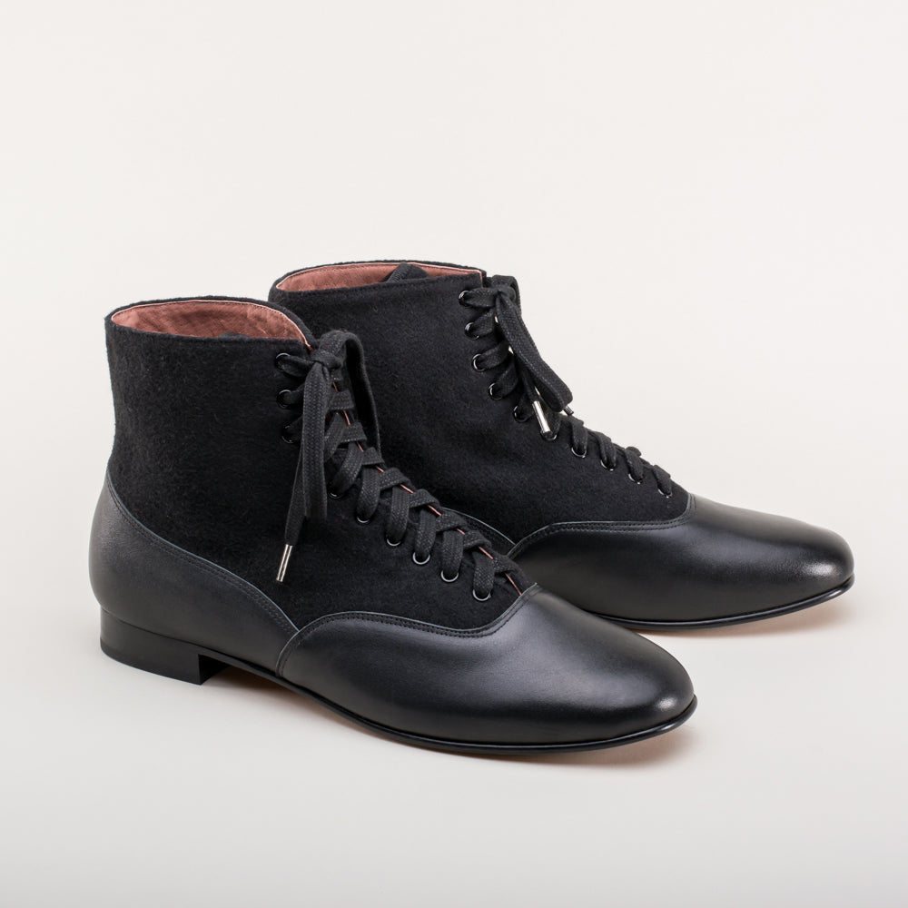 If you could only choose one boot for the broadest period of historic dress, the Larkspurs should be it! This faithful reproduction wool and leather bootie is accurate for a staggering 130+ years, from c. 1810 all the way through the 1930s.