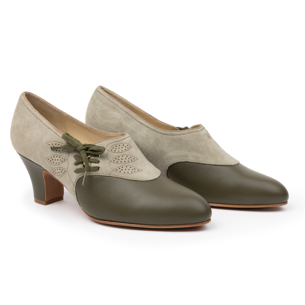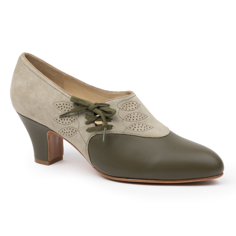 Stop traffic with Madison! Based on an original 1930s pair, these smart and stylish shoes are crafted from suede and smooth leather in coordinated shades. The uppers feature detailed decorative stitching framing a pattern of fine perforations. 2.5"/6.35 Spanish heels are perfectly balanced, for all-day comfort. Madison's chic side closures lace up with matching cotton laces, making for an utterly charming vintage look.