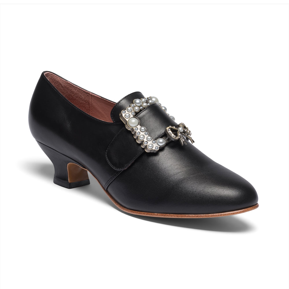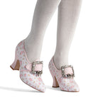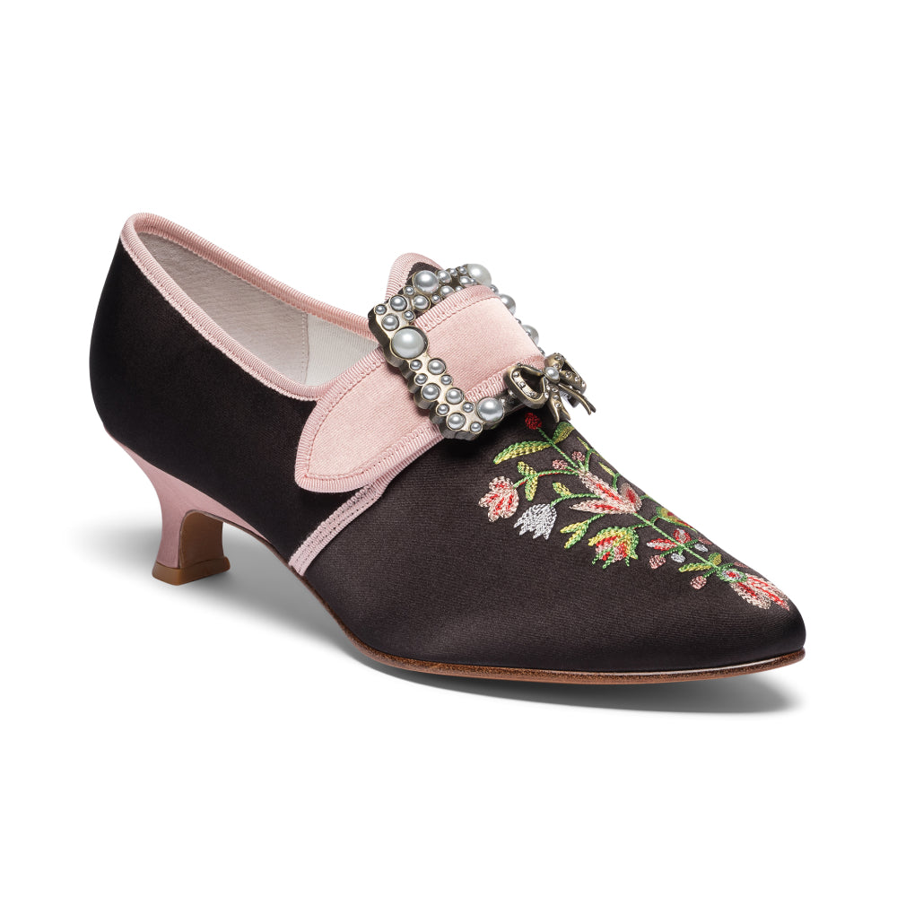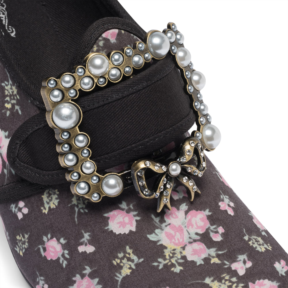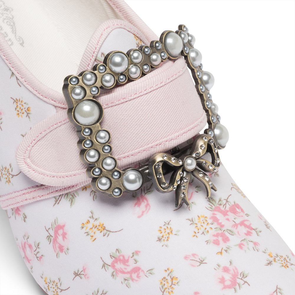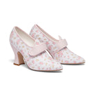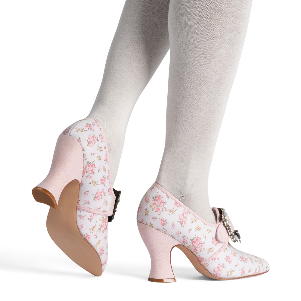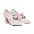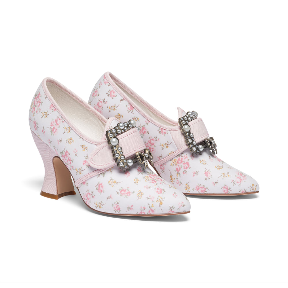 18th-century floral fantasies come to life with the gorgeous Adelaide Latchet Shoes, designed in collaboration with Elena Kanagy-Loux! Named for the 18th-century trailblazing artist Adélaïde Labille-Guiard, these shoes are dramatic, luxurious, and sure to make a statement. This curvaceous confection features 100% cotton uppers in a charming floral print set of by coordinating cotton canvas-covered heels and twill tape binding. Our custom 3.5"/ 7.62 cm French heels are perfectly balanced for comfort. Lined with cotton canvas and finished with a quality rubber sole, Adelaide is entirely leather-free. Adelaide’s 1.10"/28 mm, fully functional floral latchets look especially darling when fastened with matching Pearl Buckles.