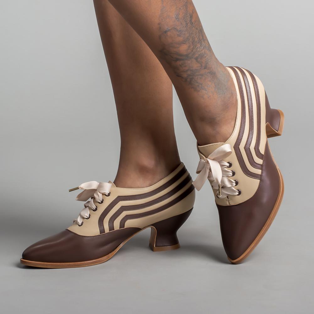 These attractive lace-up shoes have all the style and sass of footwear from c. 1900 through the 1920s and will keep you on your feet and comfortable all day, whether you're attending historical costuming events or walking the streets of New York City. Bernadettes feature our sturdy 2 inch / 5 cm French heel, welted hard-wearing leather soles, pointed toes, and an adjustable lace-up closure, plus all that style with eye-catching contrast stripes on all-leather uppers. Delicious!