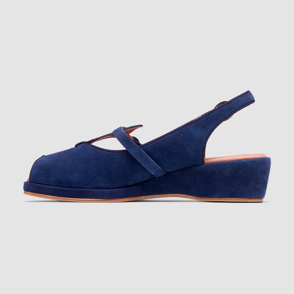 Your search for the perfect slingback sandal is over. Meet Betty, the vintage reproduction sandal that can take you from sand to city, from poolside to the dance floor. Based on an original pair of 1940s sandals from our collection, Betty has just the right amount of coverage for a wear-anywhere sandal. Betty features a brand-new, custom wedge heel that measures 2" in the heel, and a 5/8"/ 1.6 cm platform under the toe box. With a leather lining and smooth leather or suede uppers, Betty will keep you cool and comfortable- and stylish!