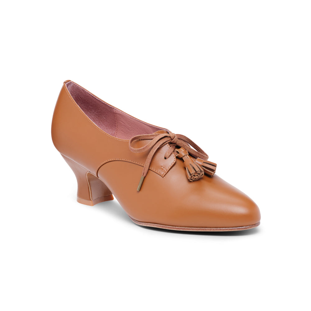 Cordelia is the versatile and attractive Edwardian Oxford everyone needs in their wardrobe. These beautifully crafted shoes are carefully reproduced from period originals, and feature a historical silhouette, lace-up closures, and removable decorative tassels. Cordelia is built on our custom, perfectly balanced, 2"/5.08 cm French spool heel, so you can walk comfortably in style. Available in a selection of neutral-colored leathers, Cordelia blends seamlessly into the leg line for a sleek and sophisticated look that goes with any ensemble. Cordelia comes in both standard and wide widths.