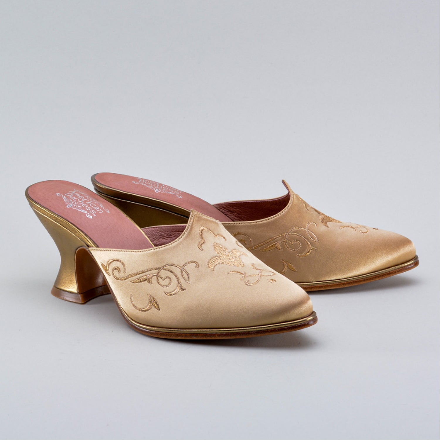 Charlotte 18th century mules blend history and fantasy in an opulent and sophisticated 18th century satin mule. Correct for c. 1700 - 1770s, these elegant backless heeled slippers feature a superbly balanced gold French heel, leather lining for easy walking, and a softly pointed toe. Pair Charlotte with your best Georgian gown, or with your everyday wardrobe to add a touch of luxury!