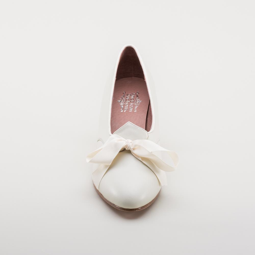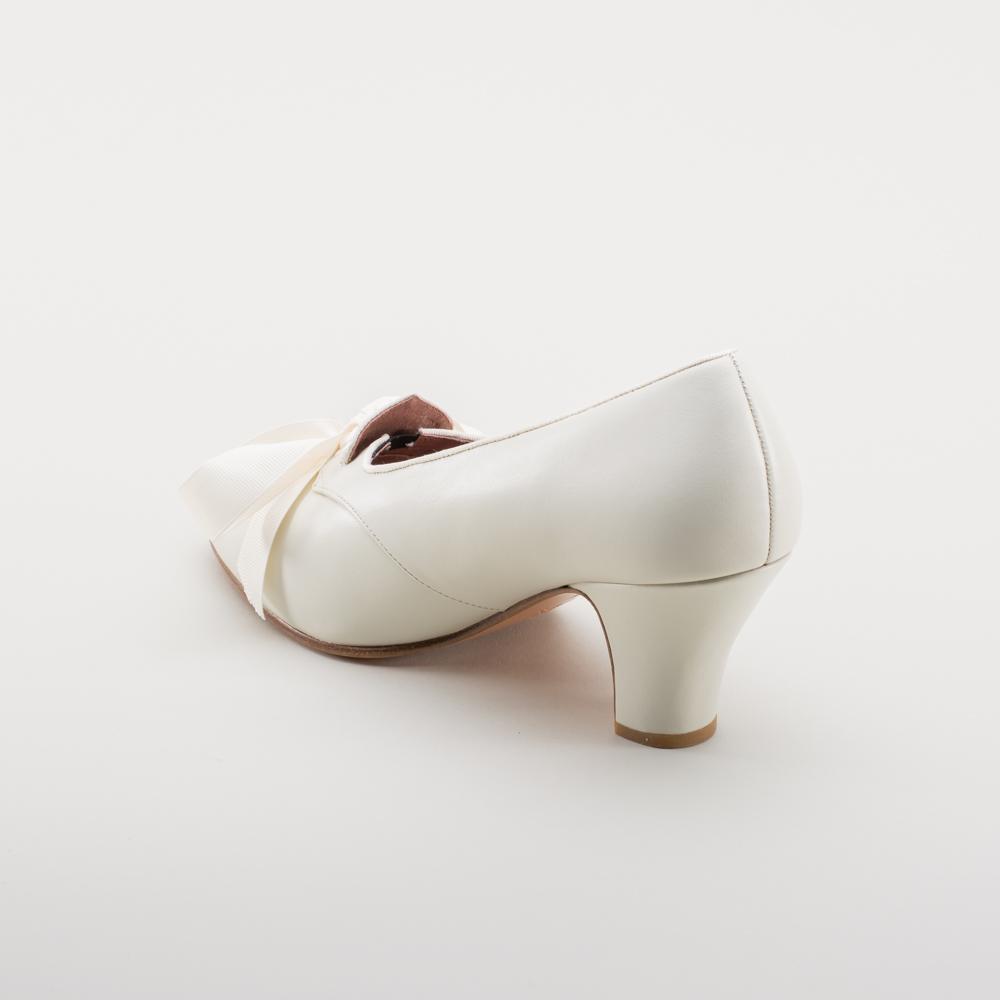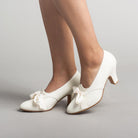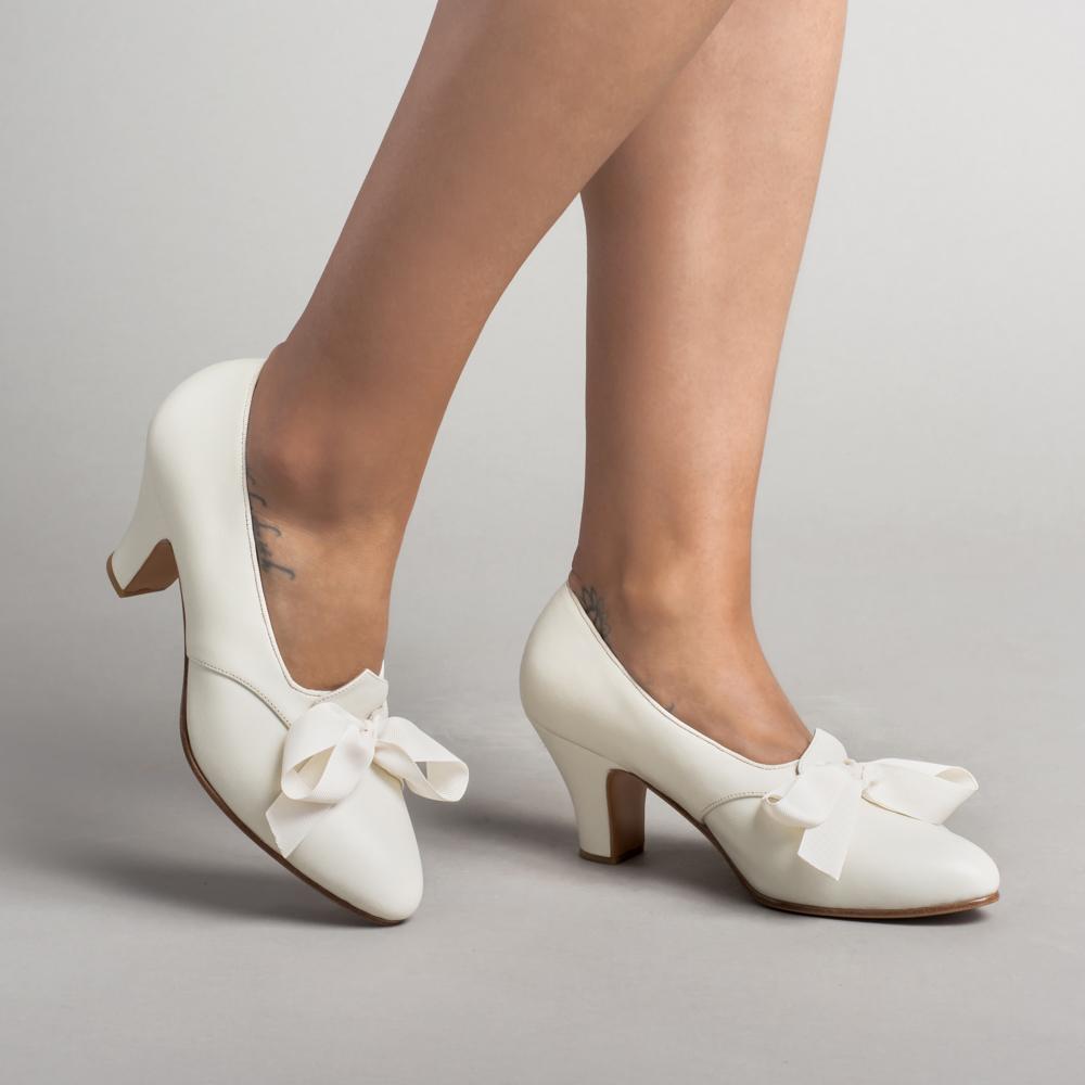 Glamour and practicality pair perfectly with the beautiful Hazel slip-on pumps. Glossy leather, an almond-shaped toe, 2.5 in / 6.35 cm repro heel, and the cutest little ribbon bow tie make these beautiful shoes perfect for the 1920s all the way through to 1950.