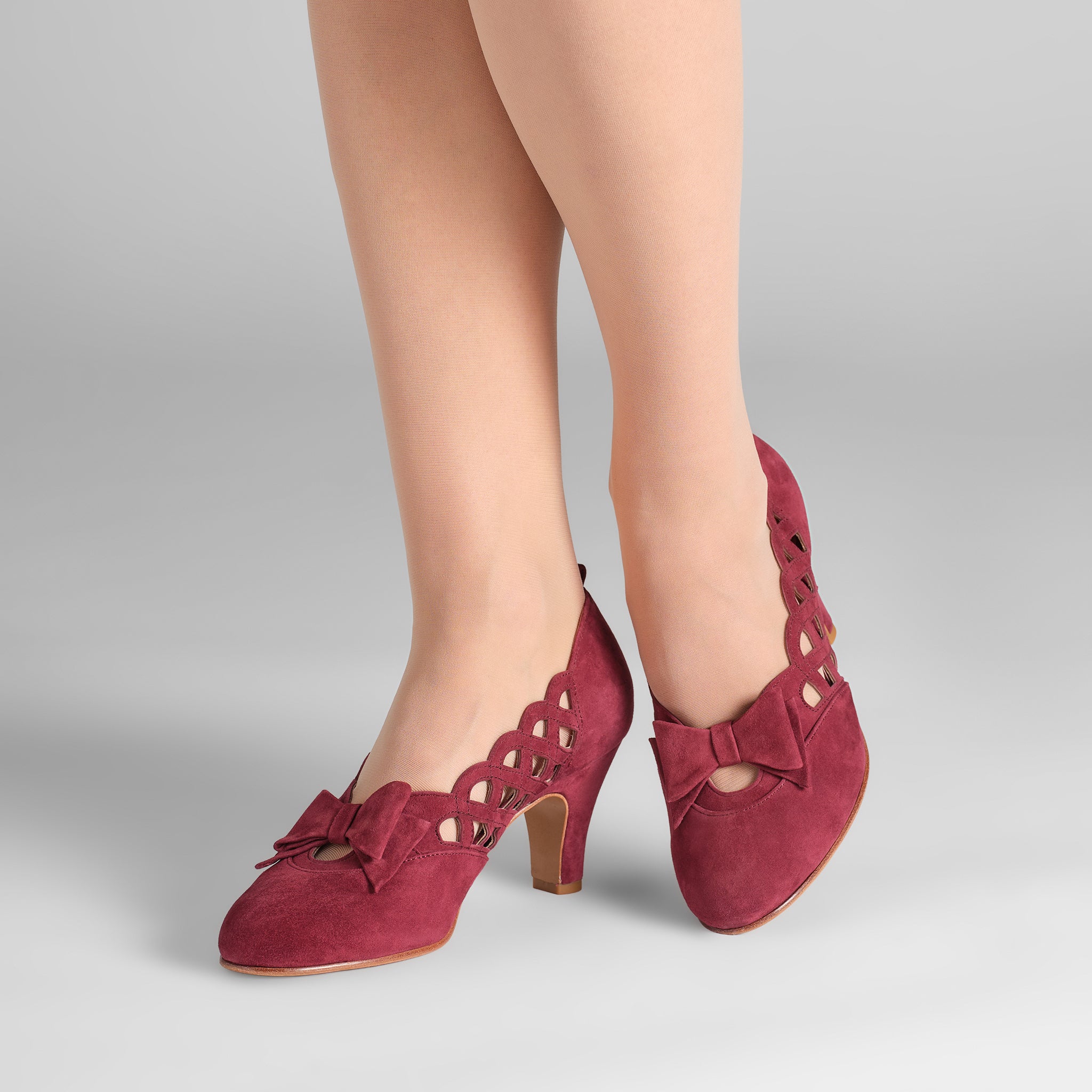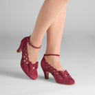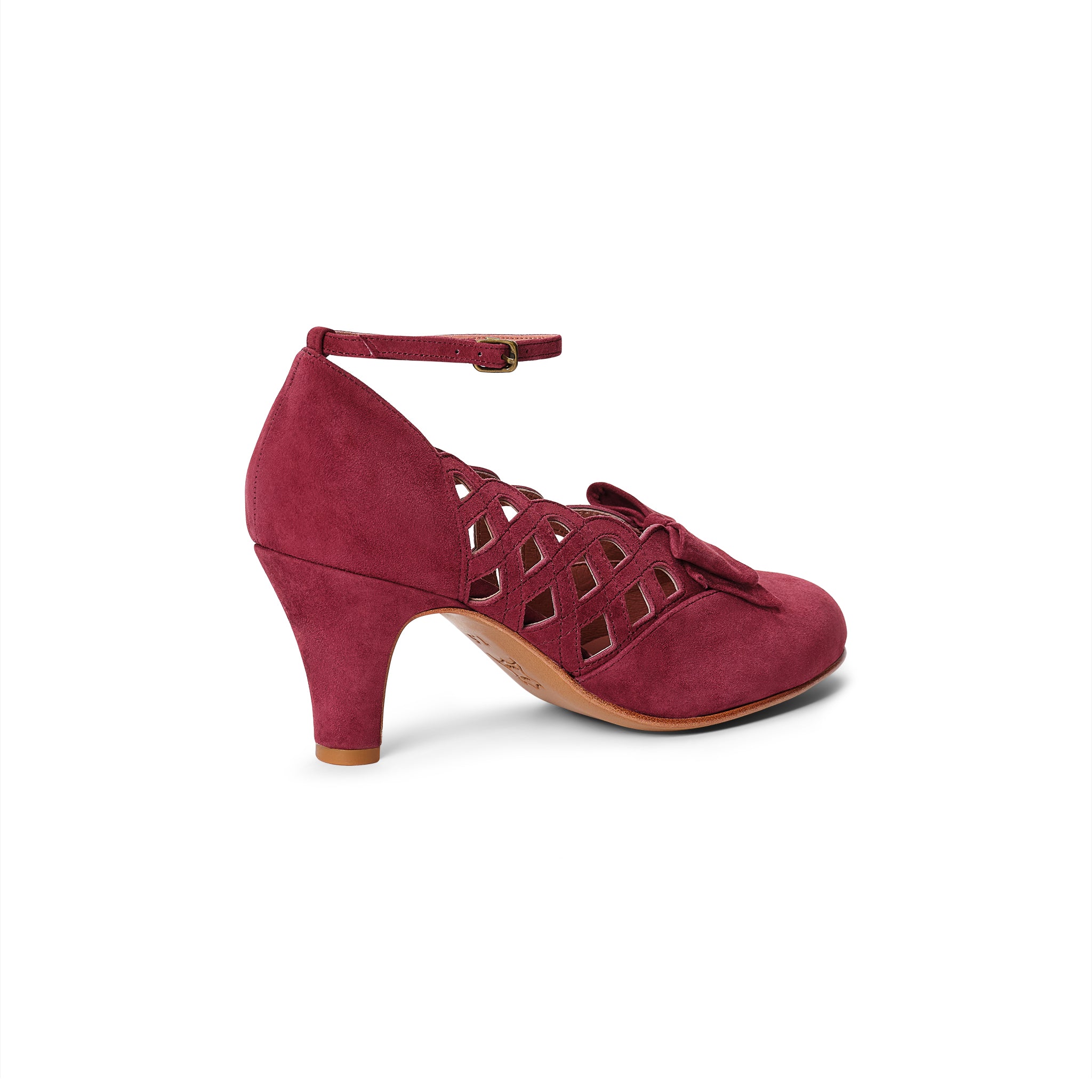 Meet Jessie, designed in collaboration with YouTuber Jessica Kellgren-Fozard from Jessica Out of the Closet! Based on original shoes from the 1940s, Jessie Pumps feature attractive lattice cut-outs, beautiful scalloped edges, and a decorative leather bow. Each pair of Jessies come with two removable leather ankle straps, to suit a wide variety of ankle sizes. Simply thread the strap through the tab on the back of the heel and fasten the quick-release buckle for days when you need some extra security, or just want to change up your look! Hidden elastic under the bow makes these step-in pumps easier to put on and remove. A rounded toe box and beautiful 3”/7.62 cm Spanish heel make Jessie perfect for 1940s-1950s ensembles.
